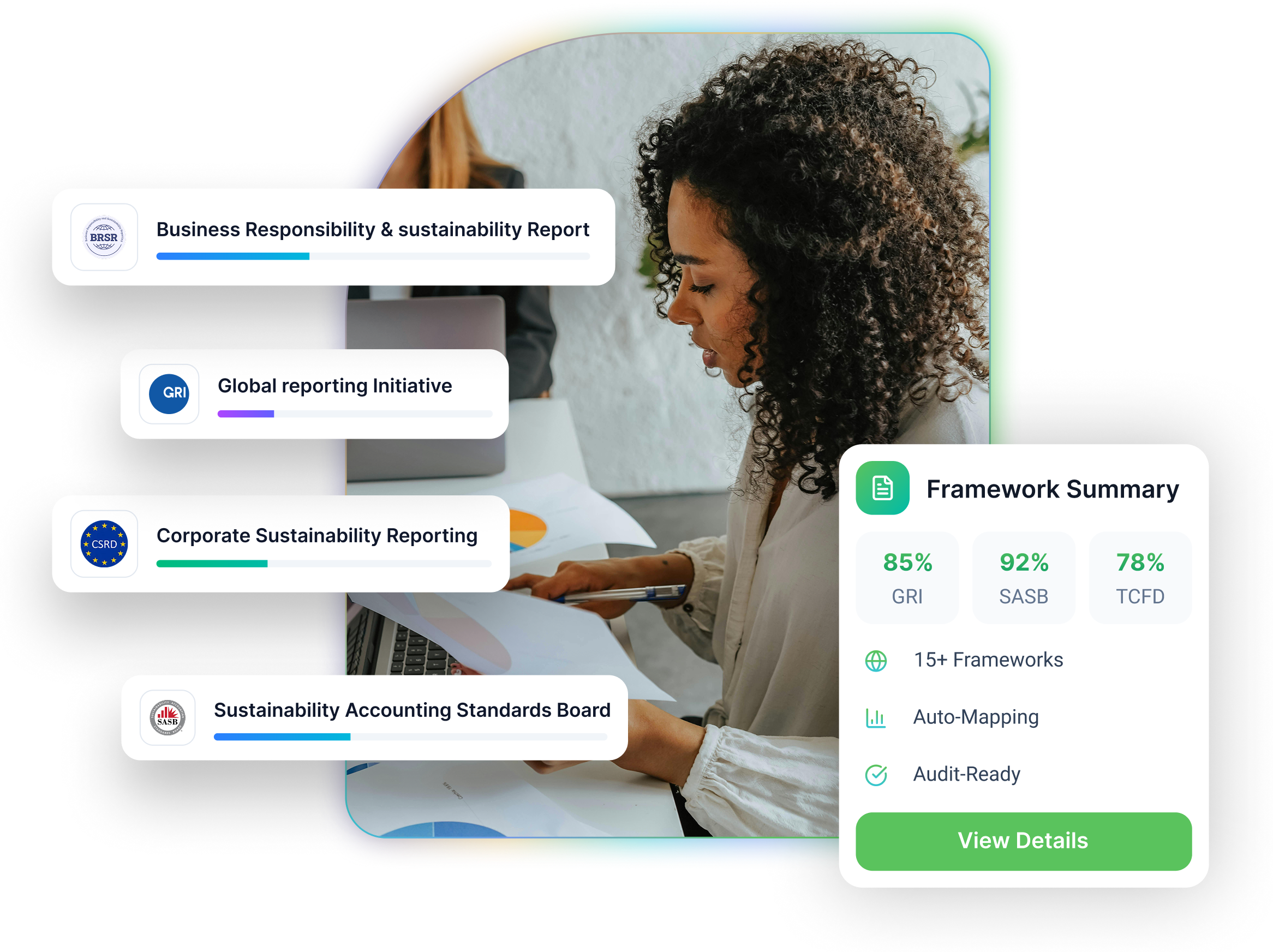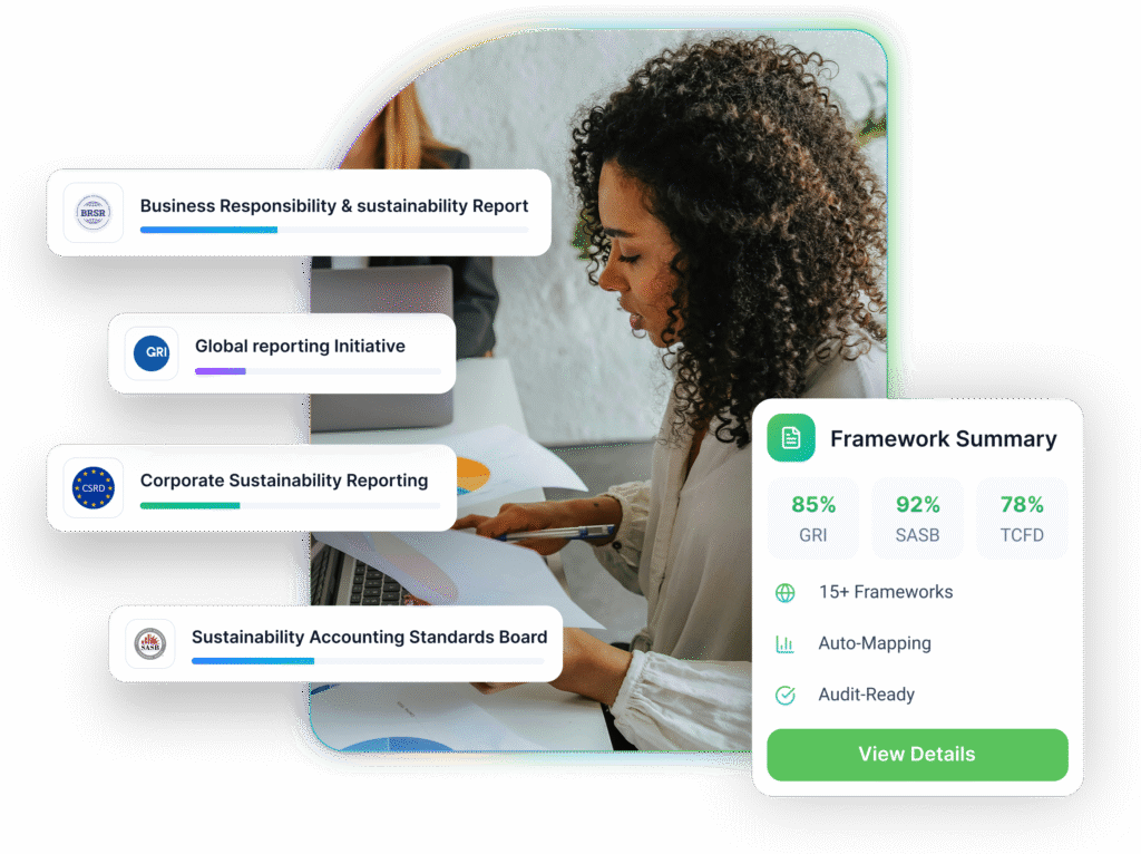 Our platform eliminates duplication and streamlines multi-framework ESG reporting by unifying disclosures across multiple frameworks GRI, CSRD/ESRS, BRSR, CDP, SASB, B-Corp  automatically retrieving pertinent data, connecting historical responses, and guaranteeing consistency.
