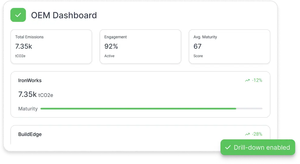 Monitoring supplier performance can be tedious and messy. Interactive dashboards in our platform helps you centralize and analyse supplier engagement, carbon emissions and maturity scores accelerating performance trend tracking.