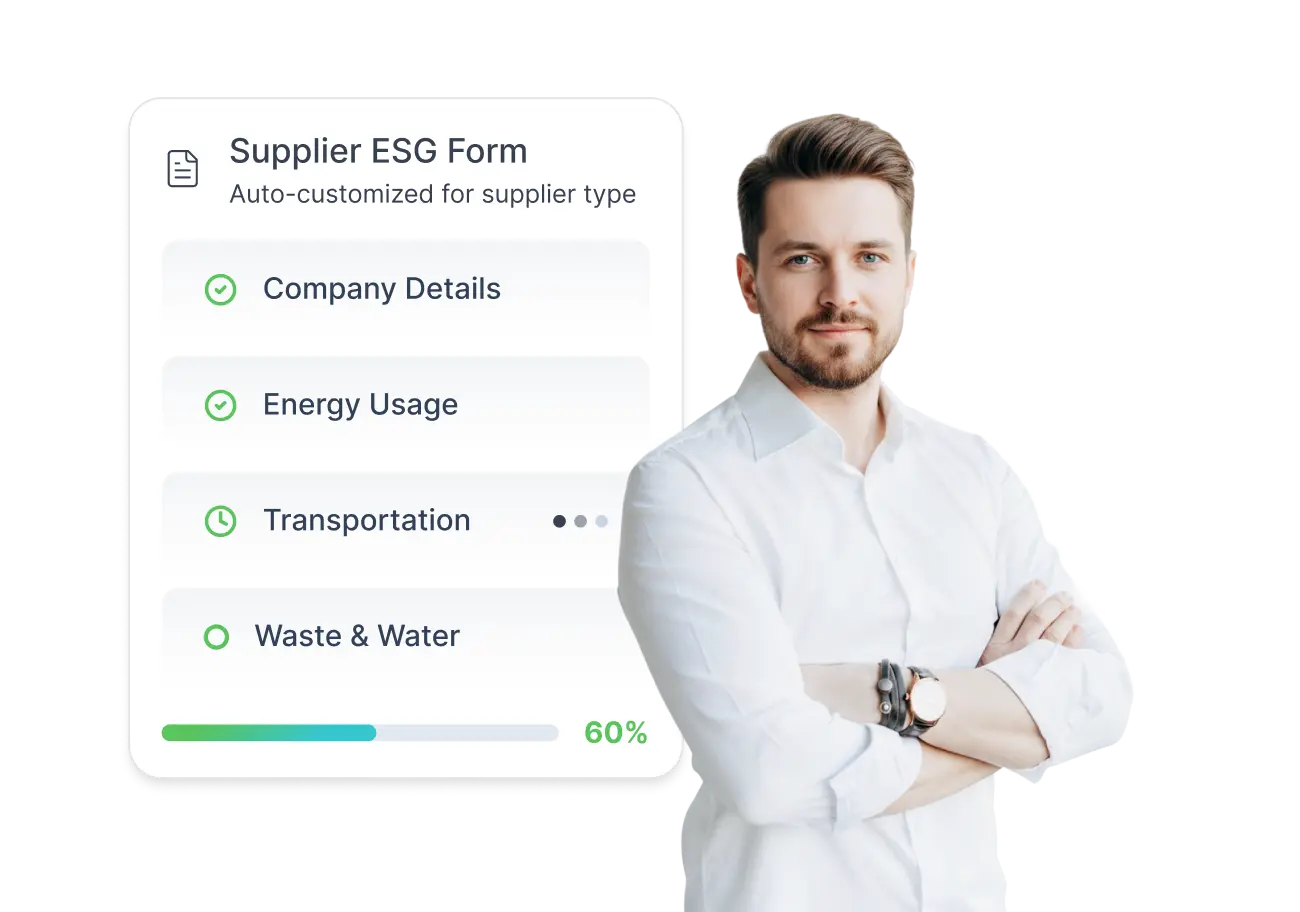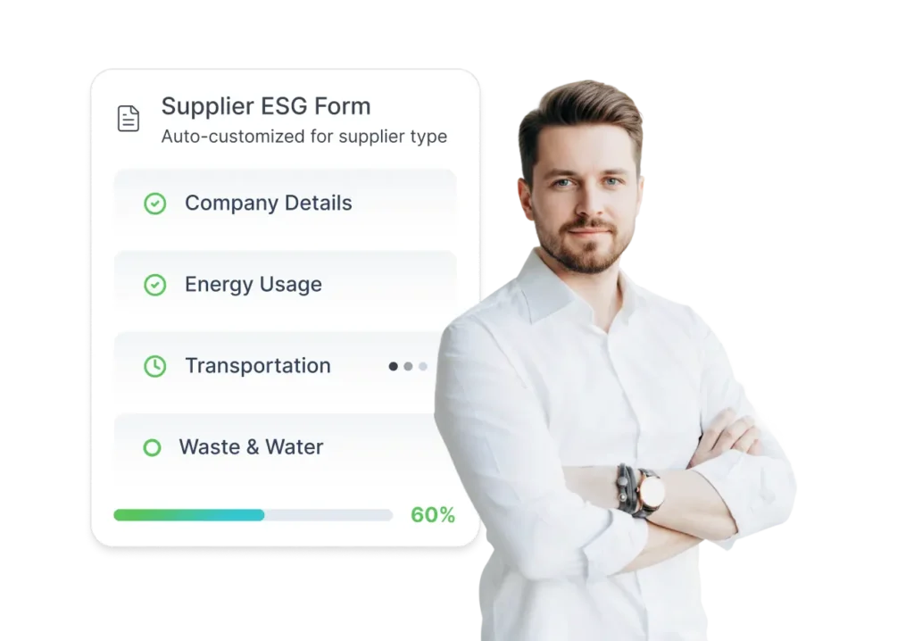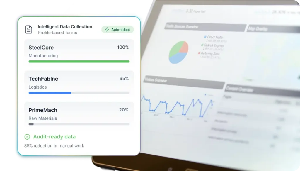 By using intelligent, profile-based forms that adjust to the type and location of the supplier, our platform guarantees that your data stays accurate and audit-ready while accelerating ESG data collection and minimising manual labour.